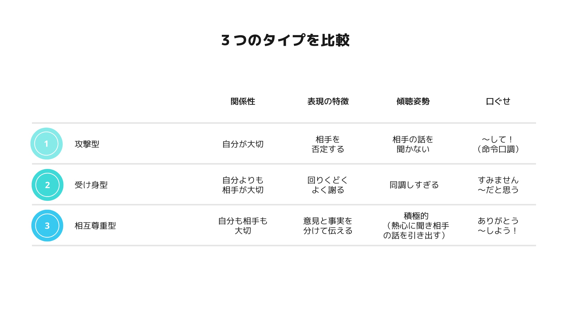 アサーティブ(相互尊重型)はこのどちらにも偏らず、「私はこう思っています」+「あなたの意見も聞かせてください」という双方向の姿勢が基本です。3つのタイプを比較してみましょう。