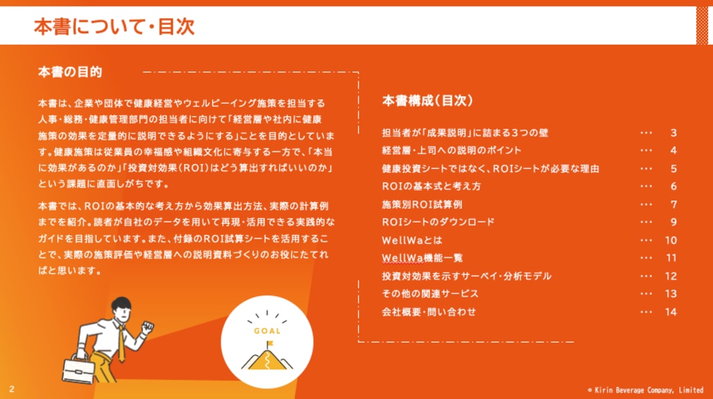 本書は、企業や団体で健康経営やウェルビーイング施策を担当する人事・総務・健康管理部門の担当者に向けて「経営層や社内に健康施策の効果を定量的に説明できるようにする」ことを目的としています。 ROIの基本的な考え方から効果算出方法、実際の計算例までを紹介。読者が自社のデータを用いて再現・活用できる実践的なガイドを目指しています。また、付録のROI試算シートを活用することで、実際の施策評価や経営層への説明資料づくりのお役にたてればと思います。